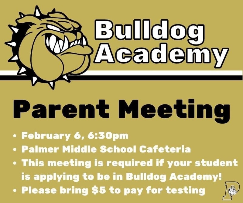 Mark your calendar for a required parent meeting if your student is applying to be in Bulldog Academy. The meeting will be held in the Palmer Middle School Cafeteria on February 6 at 6:30 P.M. You will need to bring $5 to pay for testing.